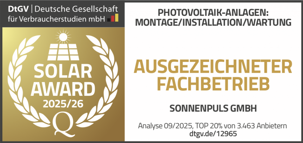 Die Deutsche Gesellschaft für Verbraucherstudien (DtGV) hat die Sonnenpuls GmbH im Rahmen des Solar-Awards 2025/26 als einen der Top 20% Fachbetriebe Deutschlands ausgezeichnet.